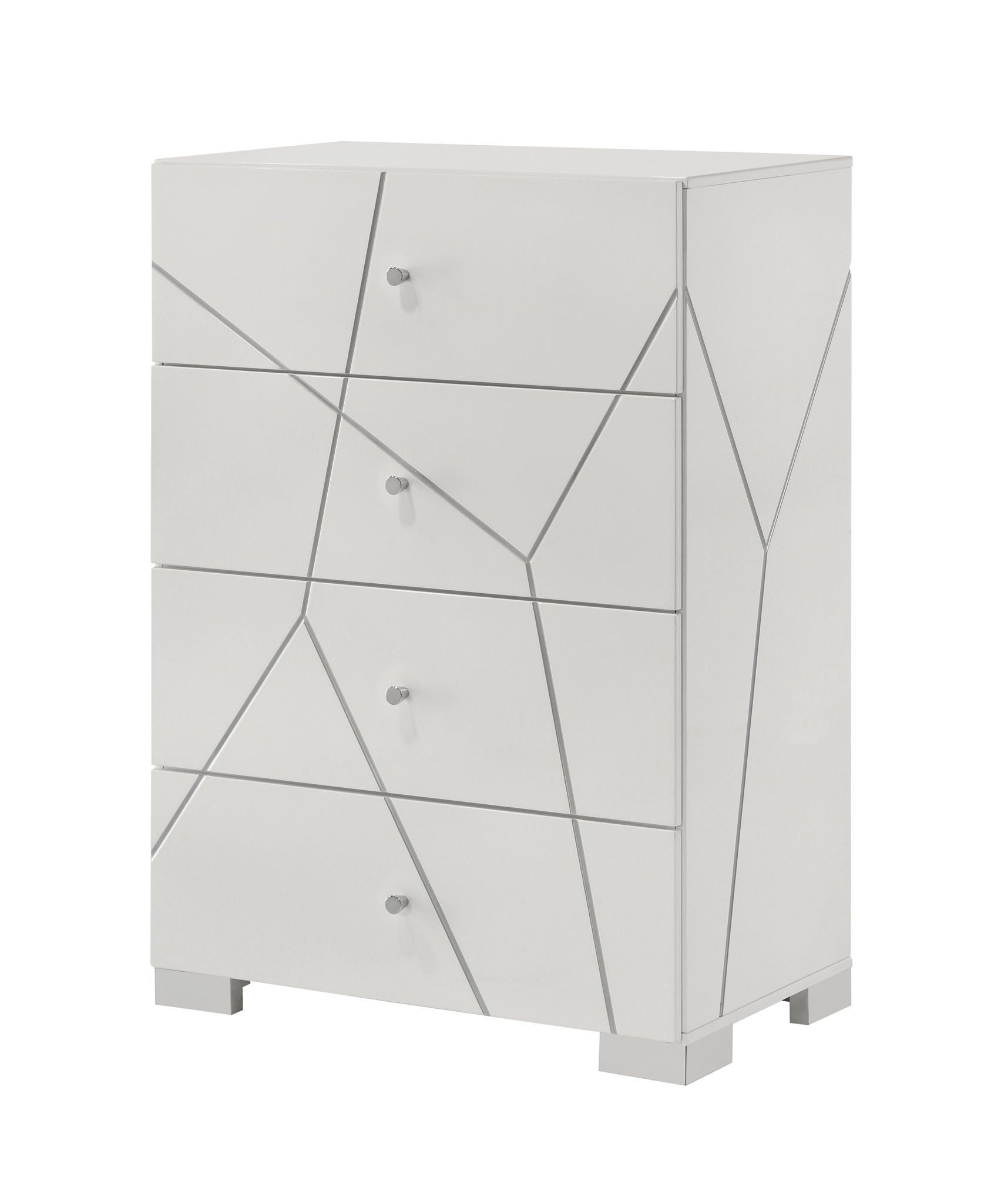 Transform your bedroom into a contemporary sanctuary with this sophisticated and stylish furniture ensemble. Defined by its bold geometric accents and pristine high-gloss white finish, this collection exudes modern elegance while maintaining a clean, minimalist aesthetic. The centerpiece bed is enhanced with a dramatic LED-lit headboard, adding ambiance and a touch of luxury to your space. Coordinated storage pieces, including a dresser, chest, and nightstands, provide ample organization while showcasing sleek hardware and clean lines. Perfect for creating a cohesive and serene atmosphere, this bedroom group offers the perfect blend of form and function, making your retreat as stunning as it is practical.