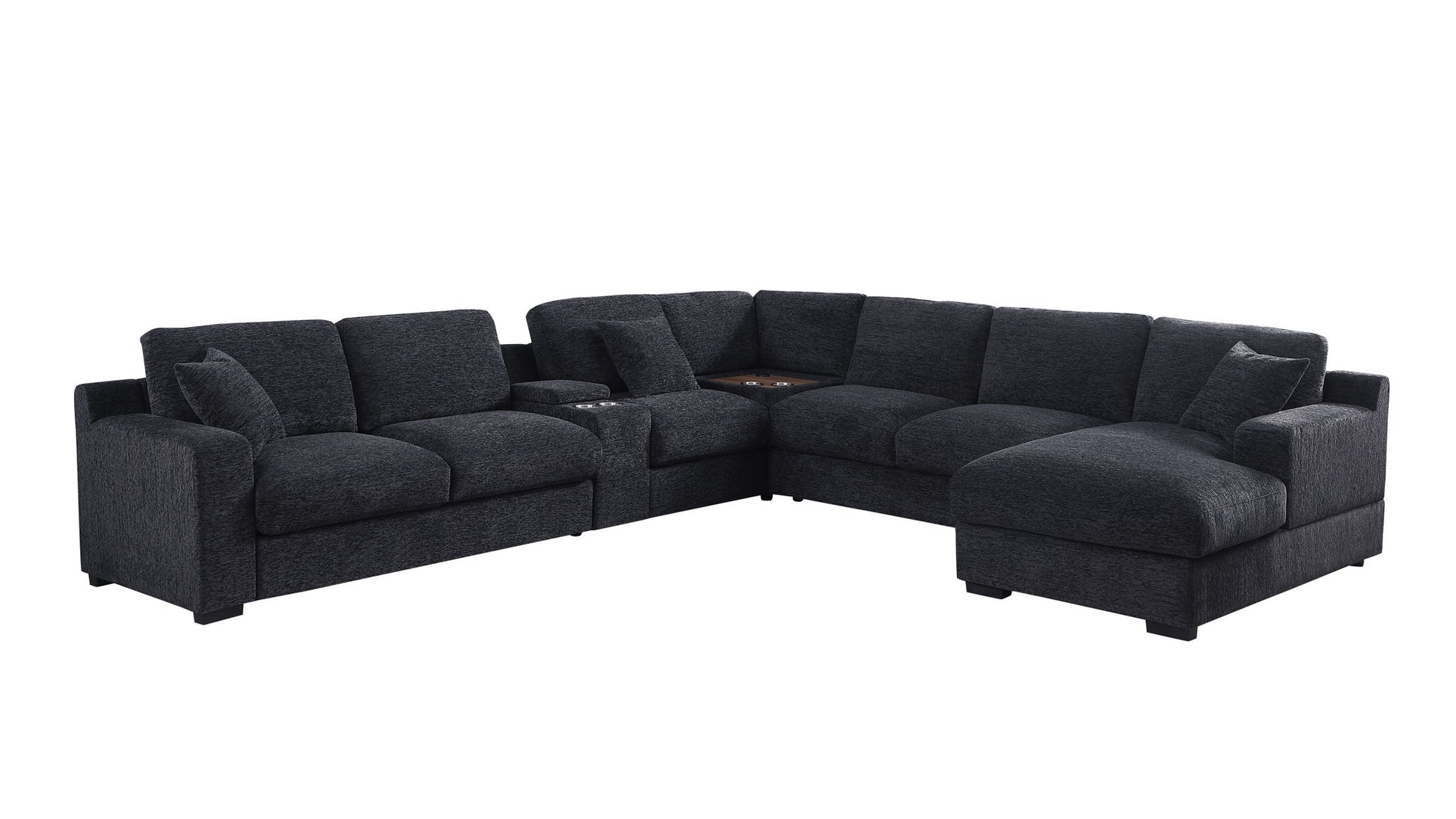 Experience unparalleled comfort and convenience with the Celine Sectional Sofa. Designed with a right-facing chaise, this sofa is perfect for lounging and relaxation. At the heart of its design is a center and corner console equipped with cupholders and charging ports, ensuring your devices stay charged while you unwind. This modular masterpiece includes an armless chair and loveseat, alongside a versatile console that can be assembled on either side to suit your space. The sofa comes with three plush throw pillows, enhancing its cozy appeal. Embrace both style and functionality with the Celine Sectional Sofa, a perfect addition to any modern living space.