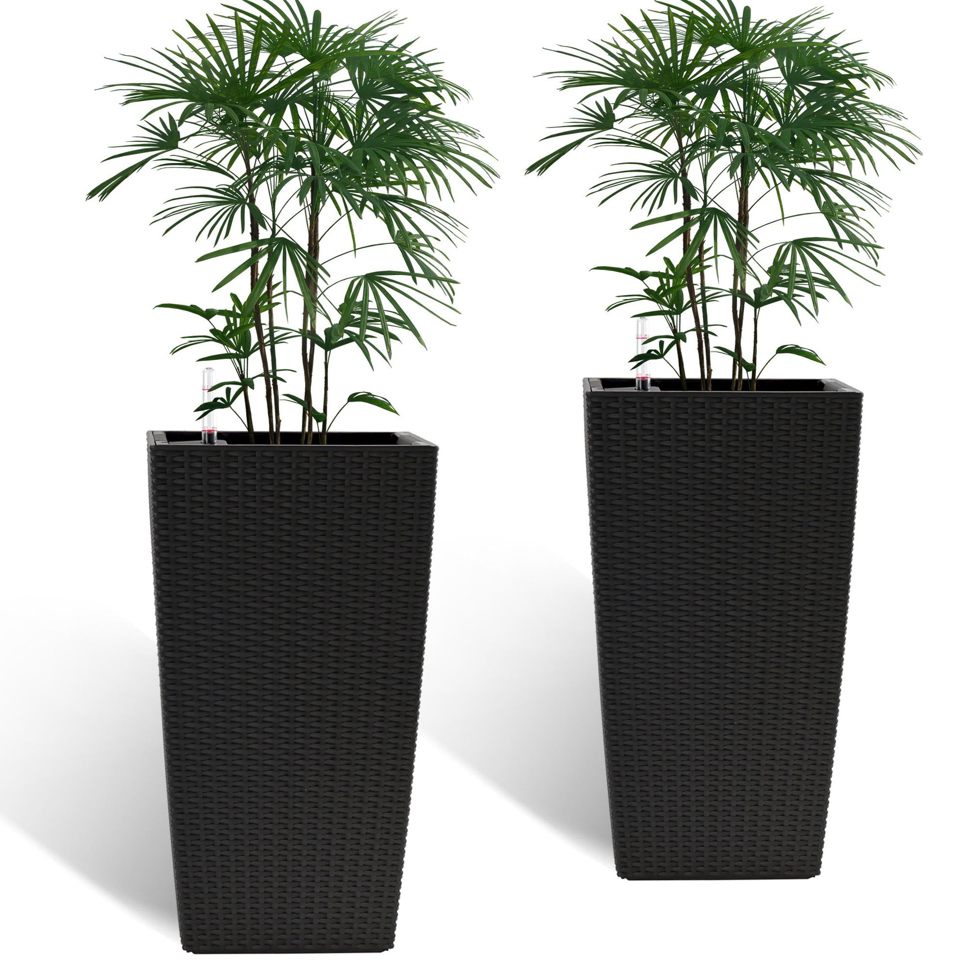 Elegant Square Planter With Automatic Watering System, Faux Rattan Design, Polypropylene (Set of 2) - Black