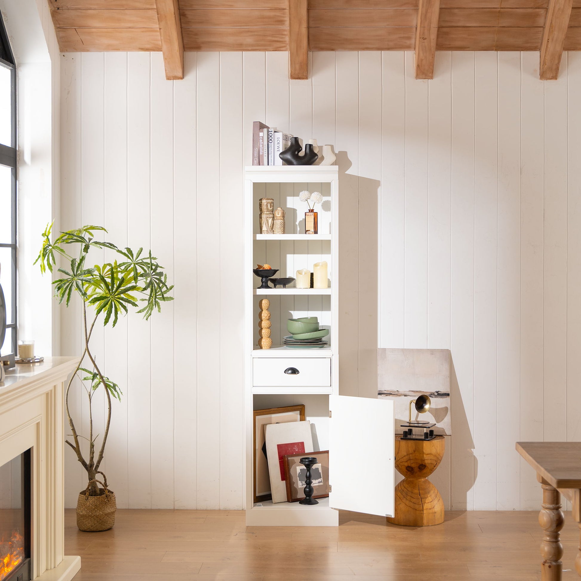 Retro Style 75'' Tall Display Shelf With Cabinet For Hallways Living Room Kitchen - White