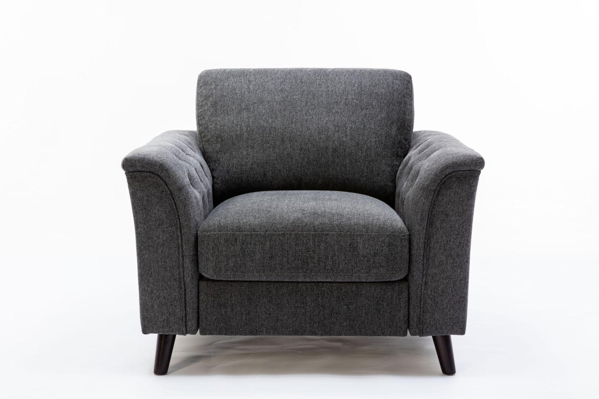 - Elevate your home's interior with the Stanton Linen Loveseat. This exquisite piece of furniture seamlessly combines classic aesthetics with modern comfort, making it the perfect addition to any living room or entertainment space. The flared tufted arms not only add a touch of sophistication but also provide extra comfort and support for your arms as you relax. The dark finish solid wood legs not only provide stability but also complement the upholstery, creating a harmonious and luxurious aesthetic. Featuring a comfortable and supportive seating experience for lounging with a good book or entertaining guests. Whether you are hosting a gathering or simply relaxing after a long day, this chair is your ideal companion.